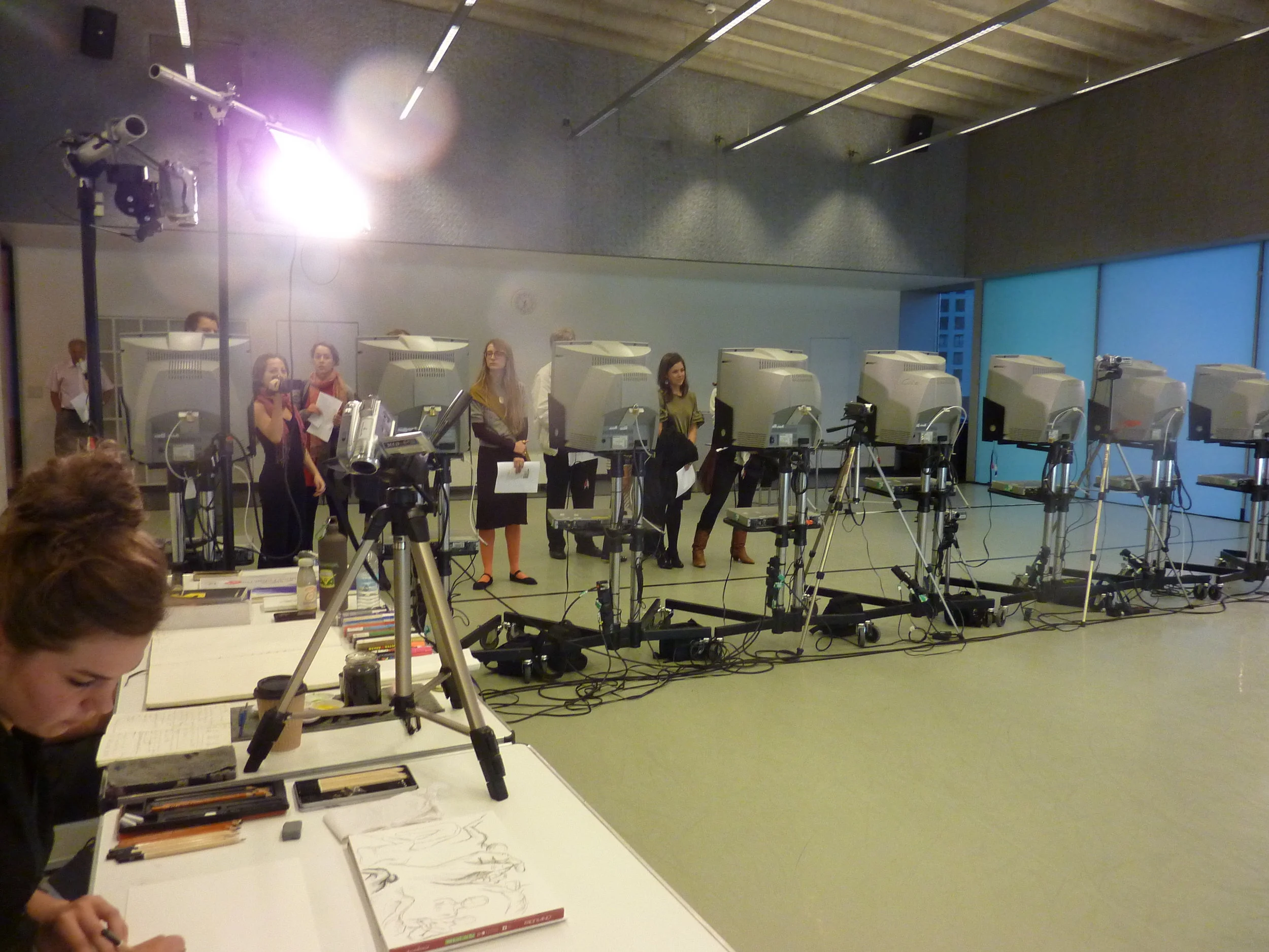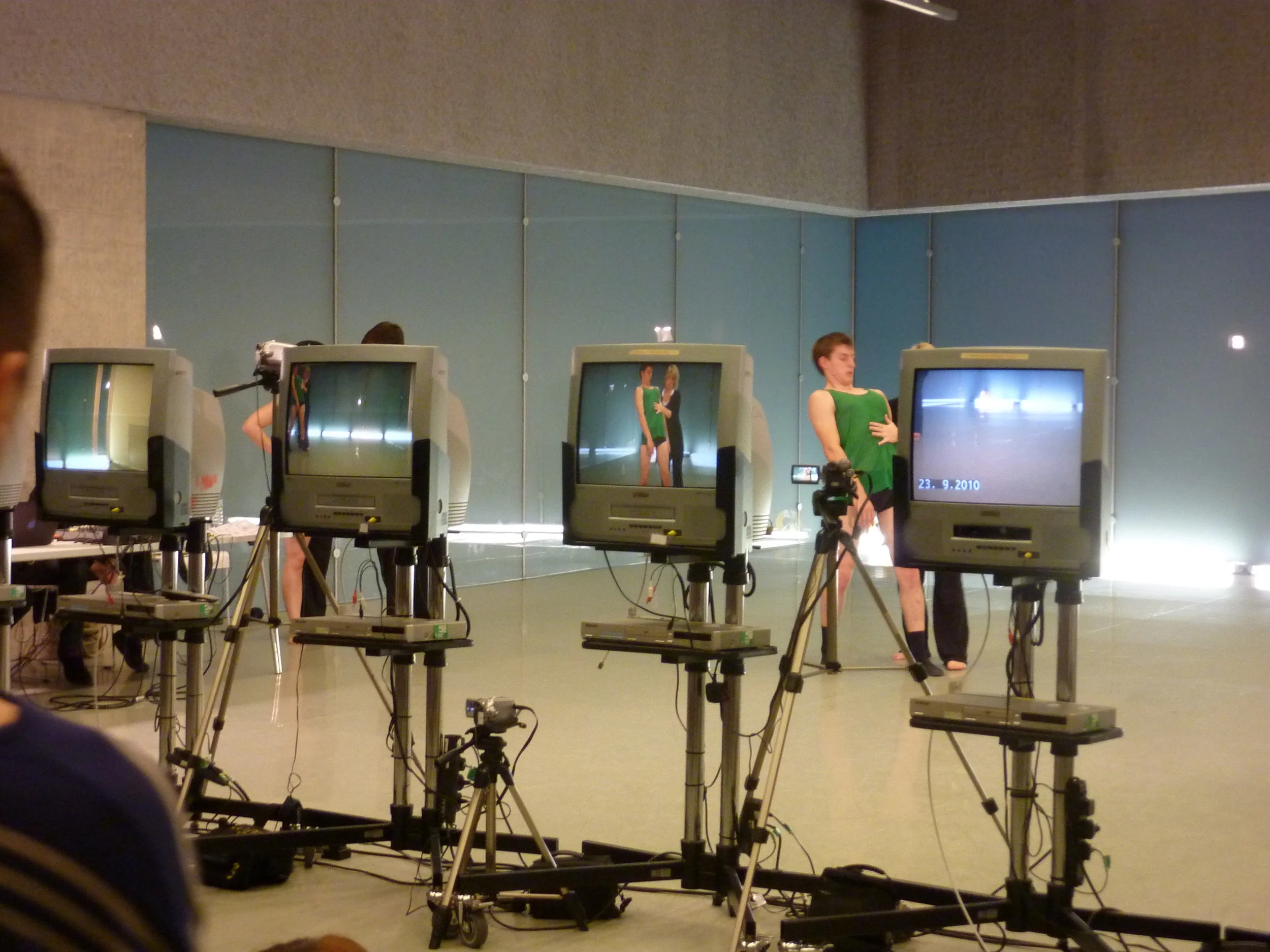 Anthropologists, dance practitioners, photographers, sound artists, visual artists, and writers are invited to respond from inside the installation. Their responses are fed to television screens so that spectators outside of the space but within the gallery can witness the research process. In doing so, the work asks “what is the role of the dancer as he/she is being watched? What is the role that the physical appearance of the dancer plays in the situation? What role does the mode of presentation play in the perception of the moving figure? How does improvisation affect or not the relation between the performer and the spectator?”.